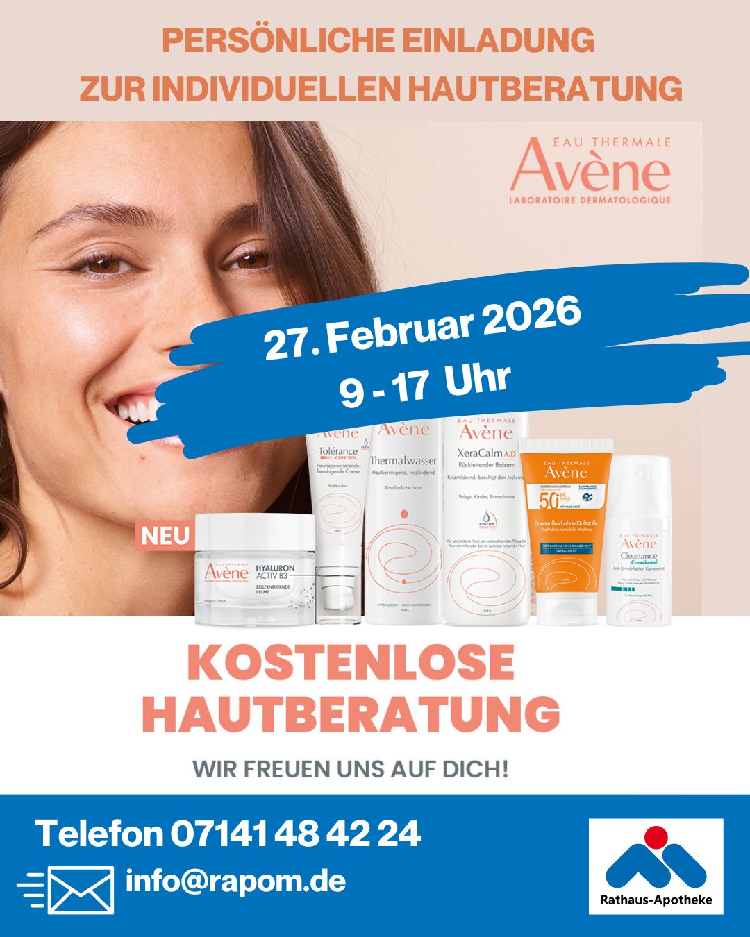 Entdecken Sie die Welt der Hautpflege mit AVÈNE! Am 27. Februar laden wir Sie herzlich zu unserem exklusiven Hautberatungs-Tag in der Rathaus – Apotheke ein.